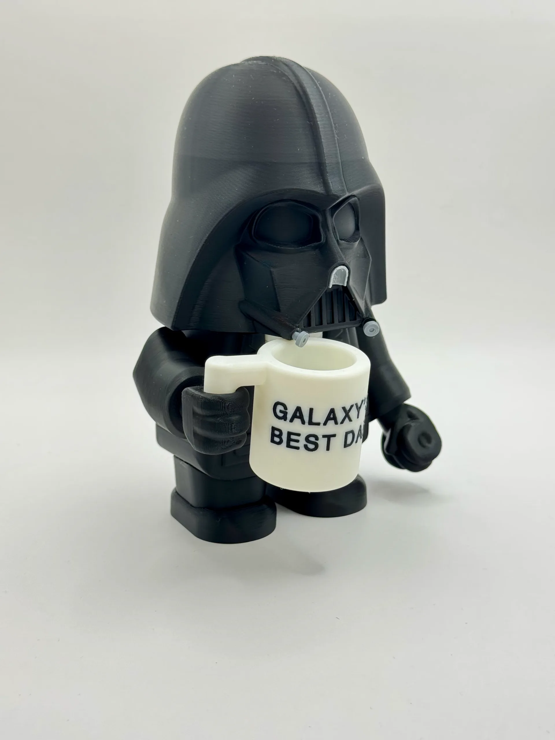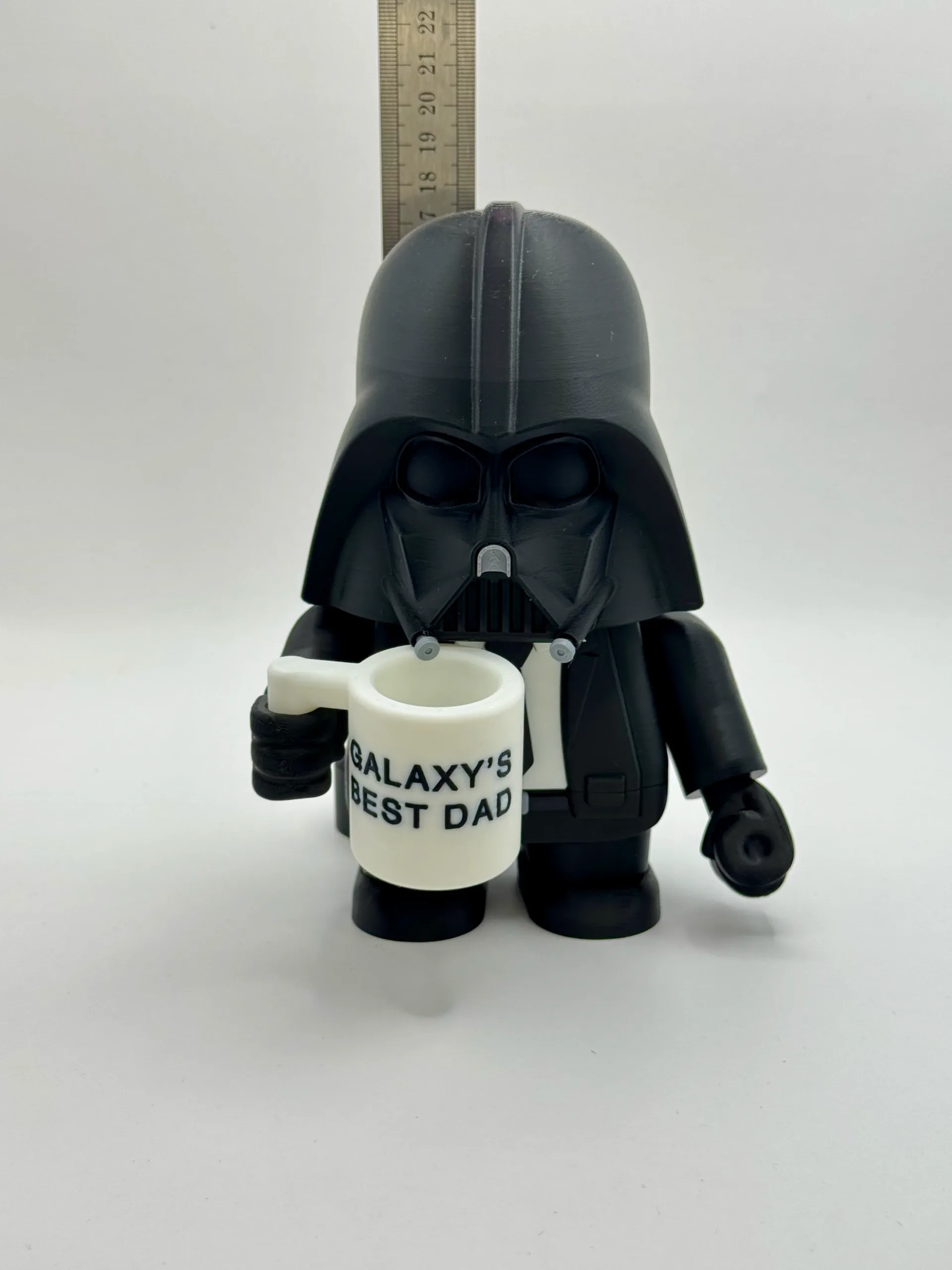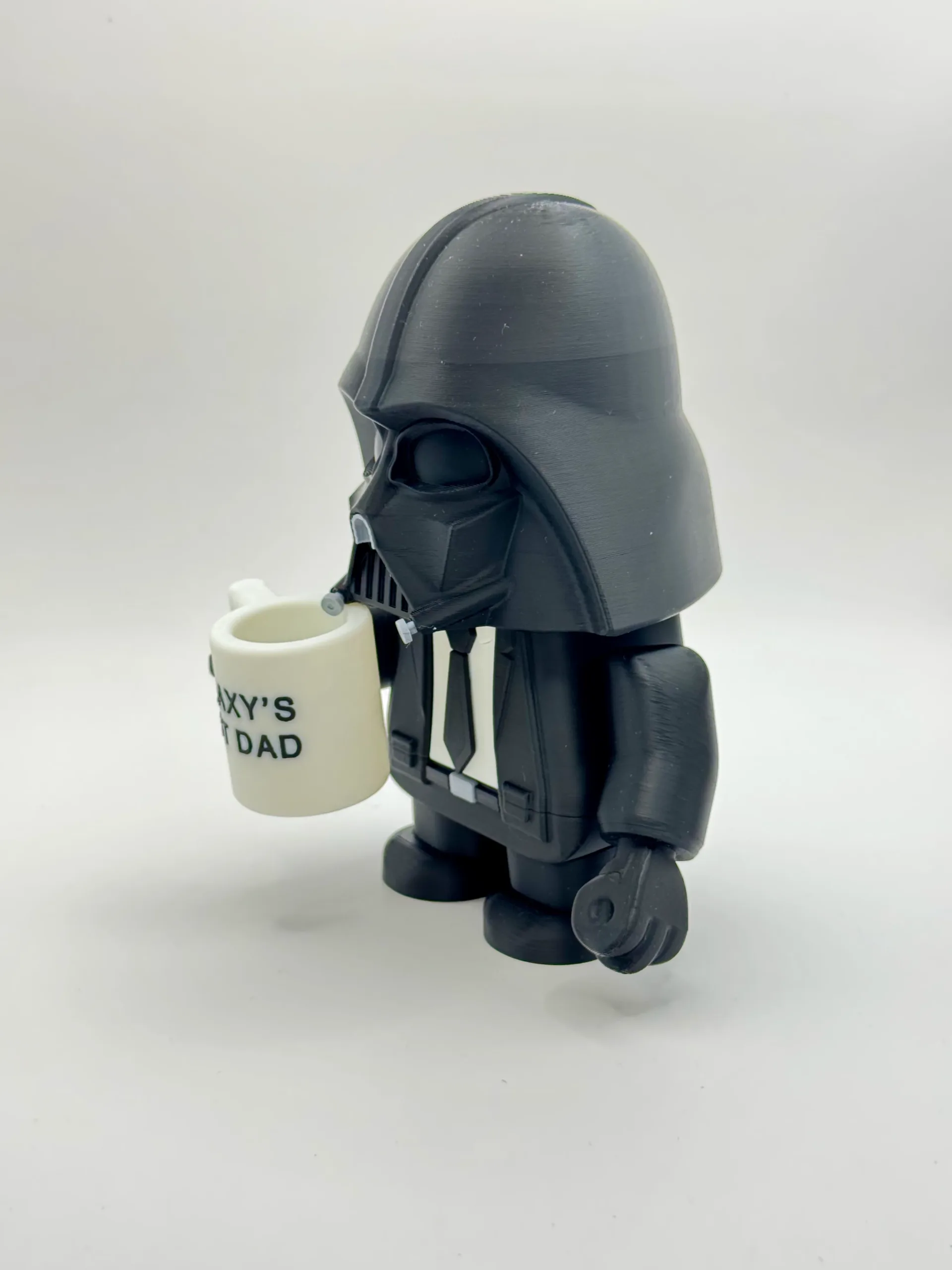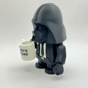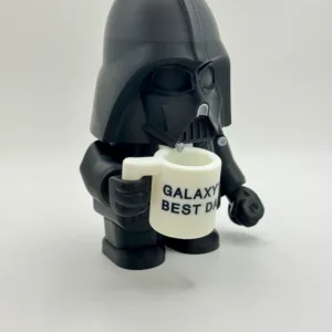 U elegantnom crnom odijelu, umjesto svjetlosnog mača drži šalicu, pokazujući svoju mekanu stranu — savršeno za tate, fanove Star Warsa i kolekcionare koji vole malo humora uz mračnu stranu.