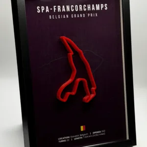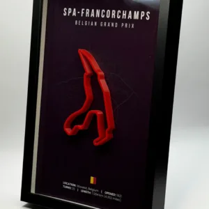 Dizajnirana za istinske ljubitelje Formule 1, ova uokvirena 3D printana staza spaja preciznost izrade i moderan, minimalistički dizajn. Istaknuta 3D struktura staze daje dubinu i karakter, dok visokorezolucijska pozadina i drveni okvir stvaraju elegantan, galerijski izgled.